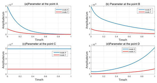 From Figure 5, four points A, B, C, and D are taken to illustrate the vibration of the resonator. The amplitude evolution with different excitation parameters is simulated by Equations (7) and (9), as shown in Figure 7.