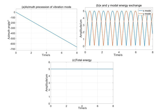 The vibration state of the resonator with parametric excitation investigated when the angular velocity . If the input angular velocity is 300°/s, the azimuthal angle of the resonator moves the free precession with time. The energy exchanged between the x-mode and y-mode, and the total energy of the resonator remains unchanged during the installation process. The simulation results are shown in Figure 9. Thus, the energy compensation of the resonator can be realized when the standing wave moves the free precession, and the dynamic range of the HRG is improved compared to the force-to-rebalance.