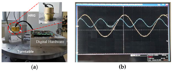 To verify the control scheme in Section 2, the hardware system was designed and implemented, as shown in Figure 10. The HRG used in this experiment is a typical three-suite structure, as shown in Figure 10a, which is composed of the resonator, the forcing house and the detection base. The spherical surfaces of the detection base and the forcing house are both covered with a metal film layer, and after laser etching, excitation electrodes and detection electrodes are formed, respectively. The hemispherical resonator is the core of the HRG and made of fused silica, of which the diameter is 30 mm. After chemical corrosion, vacuum annealing, balancing, metallization coating and vacuum packaging, the hemispherical resonator in HRG has a very high value of Q, and the value of Q is more than 7 million. The hardware system of the HRG with the parametric excitation has consisted of the interface of signal detection hardware, the interface of field excitation, the system of the digital hardware system based on Field Programmable Gate Array (FPGA), and the peripheral circuit. The interfaces of the signal detection hardware and field excitation are two parts of an analog circuit system, which is used to realize the signal interaction between the system and the HRG. The system of digital hardware based on FPGA is a digital circuit system, which is used to realize the control of the gyro workflow, the implementation of digital signal processing and control algorithms, and the functions of peripheral communication. The peripheral circuit includes the power supply, the communication chip, the device of protection and isolation, etc. The HRG and digital hardware board were placed on a high-precision turntable. Parametric excitation and the vibration are observed by the oscilloscope as Figure 10b.