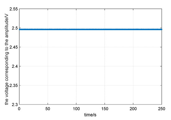 After the total energy of the vibration has stabilized, the data of detection voltage were collected; the time of collection was 250 s. The change of detection voltage with time is shown in Figure 11. At this time, the average of the detection voltage corresponding to the amplitude was E = 2.496 V; this was a horizontal straight line, and did not decay with time.