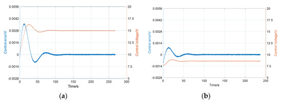 The control effect of the single-frequency parametric excitation and the double-frequency parametric excitation in the experiment are shown in Figure 12. Figure 12a shows the result of single-frequency parametric excitation. When the energy is stable, the control voltage is 15.1 V. Figure 12b shows the result of double-frequency parametric excitation. When the energy is stable, the control voltage is only 8.5 V. Clearly, the control voltage of energy compensation under double-frequency parametric excitation is lower than single frequency parametric excitation. Therefore, when parametric excitation is used to maintain the energy vibration of the resonator, the double-frequency method has higher energy compensation efficiency.