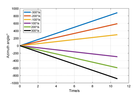 Finally, it was verified that parametric excitation of the HRG in the whole-angle control has the function of angular velocity integral measurement. Using the experimental device shown in Figure 10, the speed of the turntable was set to 300, 200, 100, −100, −200 and −300, as shown in Figure 14. The standing waves are linear precessions at different angular velocities.