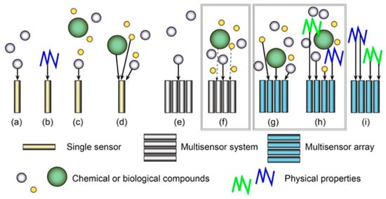 Types of sensors and their ensembles according to the studied characteristics of a sample. Single-sensor (a–d), multisensor systems (e,f), multisensor arrays (g–i) and possible targets for detection. Detailed descriptions are provided in the text.