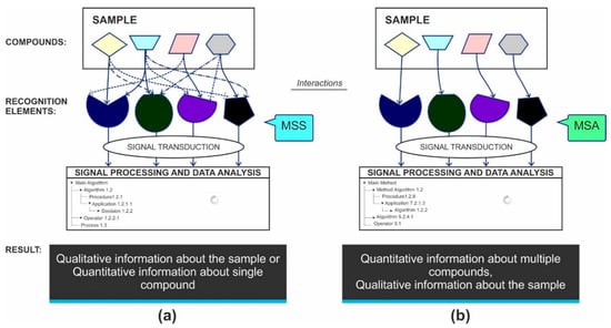 Schematic representation of the sample analysis path for an MSS (a) and an MSA (b) with recognition elements.