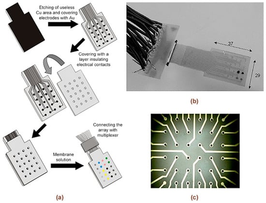 The choice of the (micro)electrode array architecture depends on a sample type and a detection method. Obviously, if the sample volume is large (i.e., given in mL), is preferable to choose conventional electrodes of normal size,, since it makes the manufacturing of an entire electrode panel simple and cost-effective; besides, the overlap of the electrochemical signals from the electrodes is also reduced. However, if sample volume is up to several µL, the only available option is a miniaturized multielectrode panel. Potentiometric MSSs and MSAs are typically used as easy-to-use and time-saving analytical platforms; however, other electrochemical methods, such as voltammetry, amperometry, or electrochemical impedance spectroscopy, can be successfully applied for various analytical tasks [1,2,3,4,5,17].