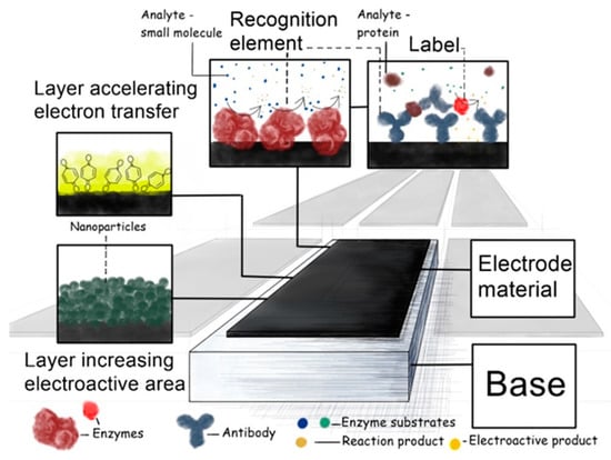 Biosamples, especially ones selected for diagnostic needs, typically contain an extremely low concentration of the target analyte, i.e., in nano-, pico-, even in femtomolar concentration range. Thereby, such a negligible amount of the analyte cannot induce significant electrical changes, which can be registered directly by recognition element-target compound interactions. In this case, an additional signal amplification element, called a label, is integrated into MSA or MSS during the analysis. Usually, the signal amplification is needed for the affinity biosensors. There are several types of labels that can significantly amplify the electrochemical response [78]. The first and, possibly, the most common, is an enzymatic label (mostly known as “enzymatic tag” or “enzyme conjugate”): a redox enzyme characterized by the high turnover number (e.g., horse radish peroxidase (HRP), glucose oxidase (GOx), tyrosinase). The enzymes of this kind can produce a high concentration of electroactive compounds in a short time period; then, these compounds undergo oxidation or reduction within the electrode material. The second type of labels are different nanoparticles and nanomaterials characterized by high electroconductivity, e.g., gold or silver nanoparticles [78].