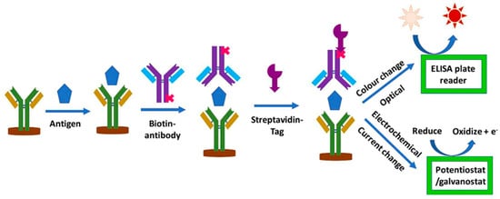 Affinity biosensors are the most common multisensor platforms applied for the screening of cancer biomarkers. Electrochemical enzyme-linked immunosorbent assay (ELISA), based on the amperometric registration system, has become an advantageous biotechnological tool in scientific research and clinical diagnosis [83,84] (Figure 7). Its high sensitivity and specificity towards target proteins—antigens, in the case of conventional optical ELISA (which can quantify biomarkers of diseases in the pg/mL range), and additional features of electrochemical assays (e.g., lower sample volume, low-cost instrumentation, short time of analysis) contributed to the commercial success [83]. Also, the electrochemical ELISA is suitable for the analysis of known cancer biomarkers, and, according to a particular task, can determine up to 96 targets simultaneously [83].