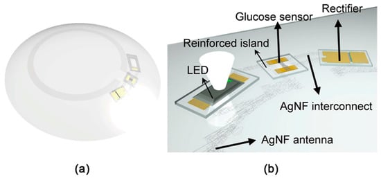 Schematic illustration of the smart contact lens. The contact lens consists of the soft base—hybrid substrate, which is made of photocurable optical polymer with micropatterned Cu layer and silicone elastomere (elastofilcon A). The functional devices integrated in the base are: a rectifier, LED, a glucose sensor and a transparent, stretchable conductor for antenna and interconnects, made of Ag nanofibers (AgNF). Adopted with permission from [135]. Copyright 2018, American Association for the Advancement of Science.