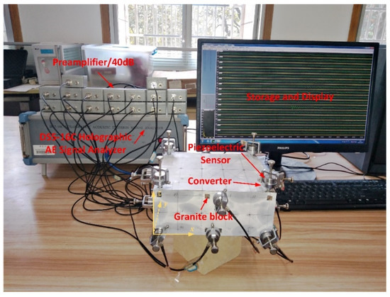 To verify the feasibility of the proposed method, the pencil-lead break experiment was performed on a granite block. The detailed acquisition process of AE signals and the experimental equipment are shown in Figure 2. This acquisition process can be divided into five steps. (1) The AE source was generated by the pencil-lead break, where the hard-black pencil lead was 0.5 mm in diameter, 4 mm in length, and broken at 30° of the contact surface; (2) the AE signal emitted from the source was received by the piezoelectric sensor and the frequency of the received signals ranged from 50 to 400 Hz; (3) the AE signal was amplified with the gain of 40 dB; (4) the amplified signal was collected by a DS5-16C Holographic AE Signal Analyzer, where the sampling frequency was set to 3 MHz to cover the signal frequency domain without distortion; and (5) the holographic AE signal was stored and displayed in the computer, and some post-processing could be performed. To determine the specific coordinates of the AE sources and sensors, the Cartesian coordinate system was established with a vertex of the block as the origin point, as shown in Figure 2. Then, the specific coordinates of the sources and sensors can be easily determined with the help of the coordinate grid lines on the white paper attached to the block.