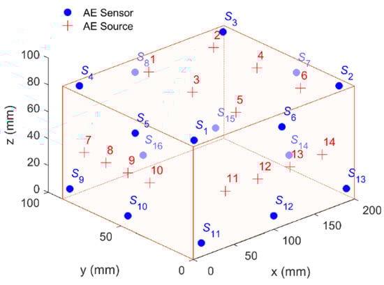 The placement of sensors has a great influence on the positioning results [38]. To achieve the optimal positioning effect, the sensors should surround the monitored area as scattered as possible. Figure 3 shows the layout of the AE sensors and sources. It can be seen that sixteen sensors were dispersedly mounted on the surface of the 200 mm × 179 mm × 84 mm block. Their coordinates were (10, 10, 84), (190,10, 84), (190, 170, 84), (12, 170, 84), (0, 80, 74), (110, 0, 74), (200, 80, 74), (90, 180, 74), (0, 170, 10), (0, 90, 10), (10, 0, 10), (100, 0, 10), (190, 0, 10), (200, 90, 10), (190, 180, 10), and (100, 180, 10) (in mm). In a real positioning system, the AE source may occur anywhere in the monitored area. The AE sources in different positions and directions may have different positioning accuracy. In order to better verify the positioning performance, we arranged fourteen AE sources generated by the pencil-lead breaks on three sides of the block. Their coordinates were (80, 150, 84), (160, 150, 84), (80, 90, 84), (160, 90, 84), (80, 30, 84), (160, 30, 84), (0, 150, 42), (0, 120, 42), (0, 90, 42), (0, 60, 42), (40, 0, 42), (80, 0, 42), (120, 0, 42), and (160, 0, 42) (in mm).