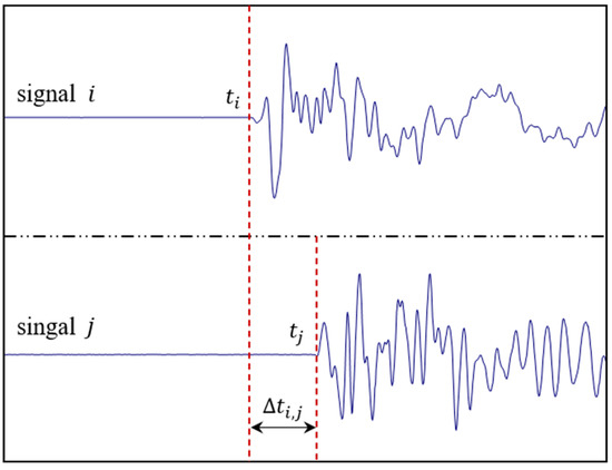 Before locating the AE source, the arrival time of each triggered sensor should be picked up first. The basic principle of arrival picking is to determine the corresponding time of the first obvious take-off point at the waveform, as shown in Figure 4. After obtaining the arrival time of each sensor, the TDOA measurements can be formed by subtracting the arrival time of sensor j from that of sensor i, (i.e., ). However, when a sensor fails, there will be an outlier in the TDOA measurements. The invalid sensors should be excluded in advance. There are two main characteristics of the invalid sensors: (1) the signal recorded by the invalid sensor is white noise or has low signal-noise-ratio; and (2) the recorded signal is irrelevant to the AE event to be located. After filtering the invalid sensors, the proposed method can locate the sources quite efficiently according to the TDOA measurements and the coordinates of the valid sensors.