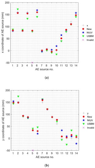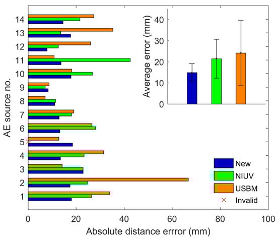 Figure 5 shows the x, y, and z coordinates of the AE sources determined by different methods. There was an invalid location of AE source no. 5 for the NIUV method. If one location has no solutions or multiple solutions, as described in the Section 1, then this location is defined as an invalid location (“Invalid” for short in all figures). From Figure 5, we can observe that the coordinates of the new method denoted by markers “●” are generally closer to the true AE source coordinates denoted by markers “+”, compared with the NIUV and USBM methods denoted by the markers “★” and “▼”. In other words, the location performance of the new method was better than that of the traditional methods. Figure 6 illustrates the absolute distance errors of 14 location results, their average errors, and the standard deviations for these three methods. From this figure, it can be seen that the absolute distance errors of the new method were higher than that of the NIUV method (expect AE source no. 3, 9, and 13) and the USBM method (expect AE source no. 3, 5, 8, and 11). Moreover, the lower average errors and the standard deviations of the new method further demonstrate that the new method has a higher location accuracy and stability than the traditional methods.