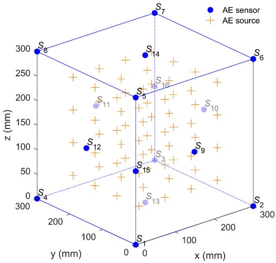 Due to the influence of environmental noises, the arrival times are often corrupted by the noises of different scales, which affects the location accuracy. The above pencil-lead break experiment verifies the feasibility of the new method, however, the noise scales in an opaque medium are uncontrollable. To further verify the influence of noise scales on location accuracy, a simulation test with controllable noise scales was applied to compare the location performance of different methods. Herein, a 300 mm × 300 mm × 300 mm cubic monitoring system was surrounded by 16 scattered sensors, and their coordinates were (0, 0, 0), (300, 0, 0), (300, 300, 0), (0, 300, 0), (0, 0, 300), (300, 0, 300), (300, 300, 300), (0, 300, 300), (150, 0, 150), (300, 150, 150), (150, 300, 150), (0, 150, 150), (150, 150, 0), (150, 150, 300), (0, 0, 150), and (300, 300, 150) (in mm). To verify the location performance of the AE source inside the monitoring area, a total of 64 virtual AE sources were uniformly generated within the monitoring area, as shown in Figure 7. In order to study the influence of noise scales on the location performance of the proposed method, different errors with the standard deviations of 0.3, 0.6, 0.9, 1.2, and 1.5 μs were added to the arrival times as the noise disturbances.