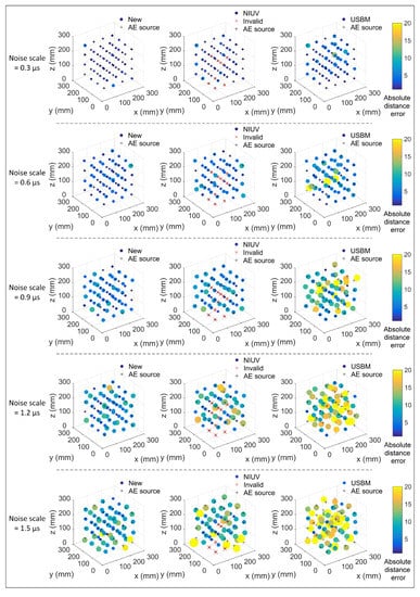 Figure 8 shows the three-dimensional location results for different sources determined by three methods under the noise scales of 0.3, 0.6, 0.9, 1.2, and 1.5 μs. The absolute distance error is characterized by the size and color of the sphere. The larger and brighter the sphere, the greater the location error. From Figure 8, we observed that under different noise scales, there were 9, 10, 10, 10, and 9 invalid locations for the NIUV method, while the new method and the USBM method had no such problems. Furthermore, the spheres for the NIUV and USBM methods are generally larger and brighter than those of the new method under different noise scales, which indicates that the new method has a higher positioning accuracy compared to the traditional methods. Although the location errors of the three methods rise with the increase of the noise scale, the positioning advantage of the new method is also more obvious.