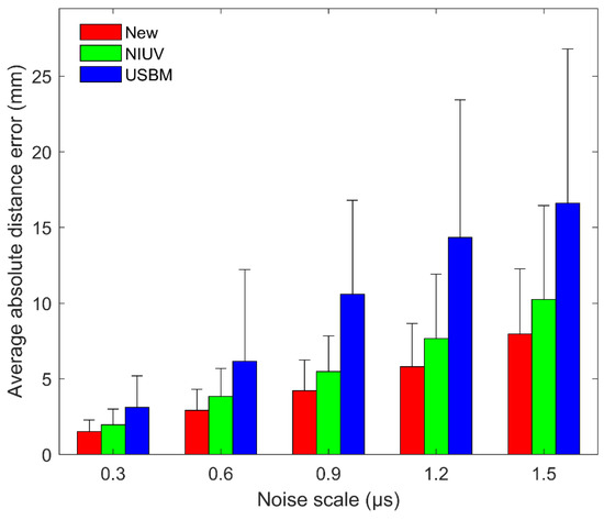 Figure 9 illustrates the average absolute distance errors and the standard deviations of the three methods under different noise scales. In this figure, the average absolute distance errors and the standard deviations of the NIUV method were calculated after filtering the invalid locations. It can be seen that the average absolute distance errors and the standard deviations of the new method were always smaller and increased more slowly than those of the NIUV and USBM methods, which shows that the proposed method had higher location accuracy and stability than the traditional methods. Therefore, the proposed method has higher noise immunity and is more suitable for noisy engineering environments.