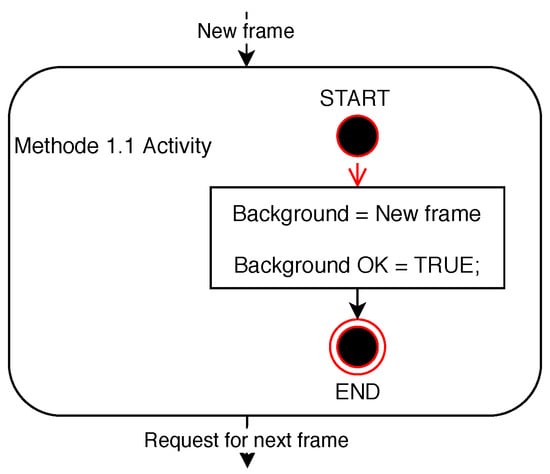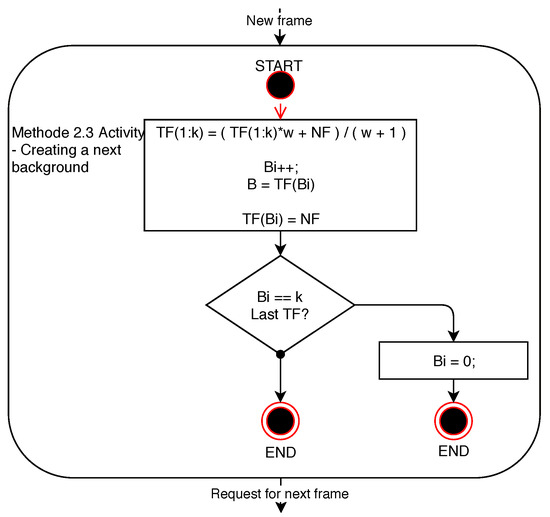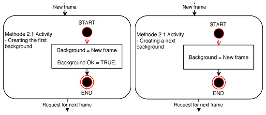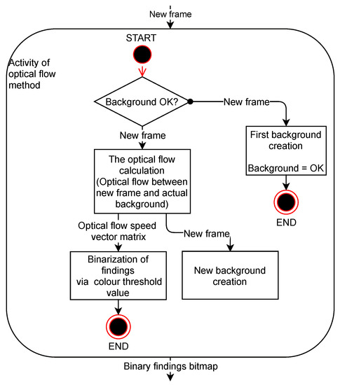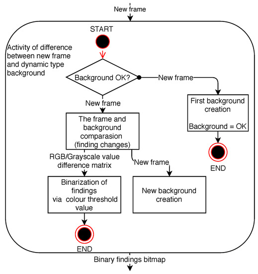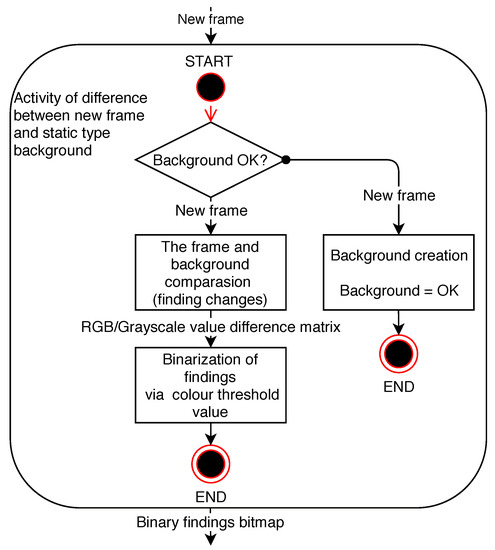 The changes detected in the frame are found to be appropriately thresholded and are then distributed to other parts of the program as a binary map of the objects found as described in the diagram of the activity applied in Figure 1.