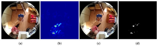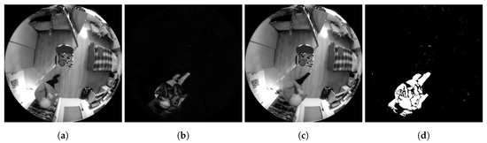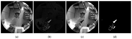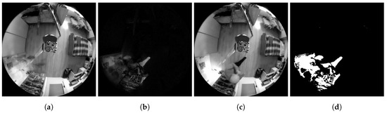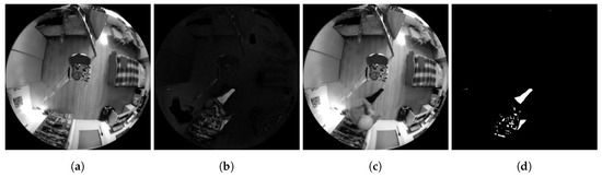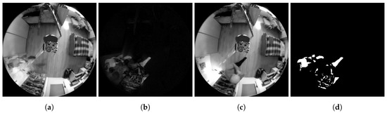 Examples of Method 1.2. functionality. (a) Background frame. (b) Difference in brightness between the currently checked frame and the background frame. (c) Currently checked frame. (d) Binarized difference in brightness between the currently checked frame and the background frame. Findings that reach a value of logical 1 (white in the frame field) are considered potential findings of a detected person.