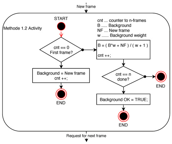 For clarity purposes, the method is hereinafter referred to as Method 1. This method uses the differences between the current frame and the background frame. A static background is considered to be a background fixed for the duration of the program run or for a period otherwise specified. Typically, such a background is compared to more than one frame of the scene. The principle of such a method is illustrated in the diagram in Figure 2. The advantage of using this method is a considerable saving of memory space when, after the static background is finally found, it is necessary to keep only one frame of the final background.