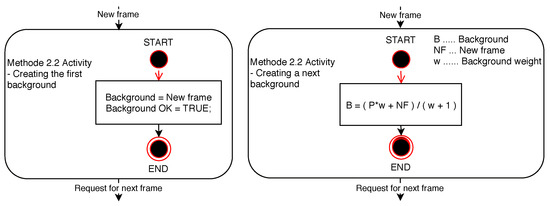 The background thus created is based on the gradual weighted averaging of the first n-frames. Due to frame averaging, the effect of changing the lighting conditions in the scene is minimized, thereby minimizing the effect of unwanted changes in pixel brightness in the frames being analyzed during the subsequent detection. The purpose of this method of background creation is also neglect of possible dynamically moving objects in the scene at the beginning of the video sequence being captured. An example of using this method is shown in a series of frames Figure 5. The background can be practically created even when dynamically moving objects are present in the scene. However, such objects can introduce significant errors in the subsequent results of the detection system.