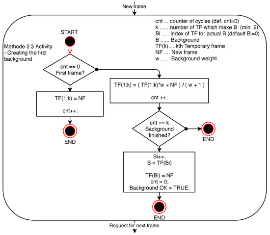 Similarly to the method of difference towards the dynamic background created by averaging of all the previous frames, the functionality of the method using a background created by averaging n-previous frames is dependent on setting the weighting parameter of the previous frame. In addition to this adjustable parameter, it is also necessary to determine the number of frames that will form the dynamic background of the current frame when the difference is detected in the image. The weight parameter of the previous background frame, when creating a new background, affects the gradual disappearance of images of dynamically moving objects or persons in the scene in order to achieve the most accurate background for the subsequent differential detection of changes in the current frame towards the background frame. The method is described by the diagrams shown in Figure 14, describing the creation of the initial background, and Figure 15 describing the creation of each new background.