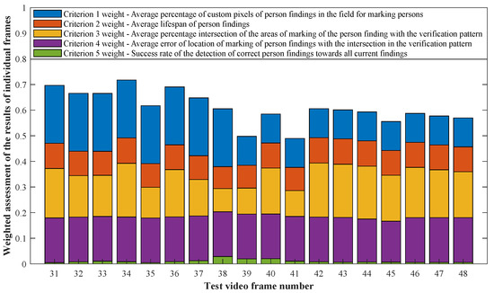 From the results shown in Table 6 (of the top-rated results), it is obvious that the top-rated configuration is the configuration of Method 1.1 having a lifespan of 12 frames, where the best-weighted score () was achieved compared to the worst rated method (Method 3) with the following score: . The best-scaled rating was achieved by Method 2.2 with a lifespan of 40 frames and a result of , and aforementioned Method 1.1 with a lifespan of 12 frames with a result of ; the worst-scaled method is Method 3 with a lifespan of 1 frame and a result of . In the attached weighted rating graphs (Figure 27, Figure 28, Figure 29, Figure 30, Figure 31, Figure 32, Figure 33, Figure 34, Figure 35, Figure 36, Figure 37, Figure 38, Figure 39, Figure 40, Figure 41, Figure 42, Figure 43, Figure 44, Figure 45, Figure 46 and Figure 47), precisely the influence and importance of using the appropriate value of the lifespan of persons, which neglects the momentary “loss” of the person found in the results of the detection of the current change in the image, are obvious. Method 1.1 with a lifespan of 12 frames is a method that uses the difference between the current image towards the static background created by the frame taken at the beginning of the test video. Errors confirming the theoretical functionality of this detection method were entered in the evaluation results (Figure 27, Figure 28 and Figure 29). These errors include longer-lasting relocation of the objects in the scene, which are then mistakenly considered as a person found; this error could be resolved by occasional restarting of the detection system, thus creating a new static background.
