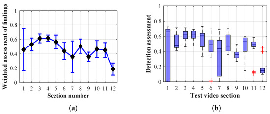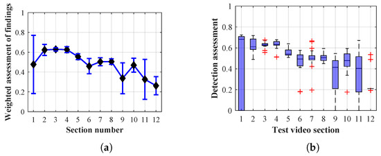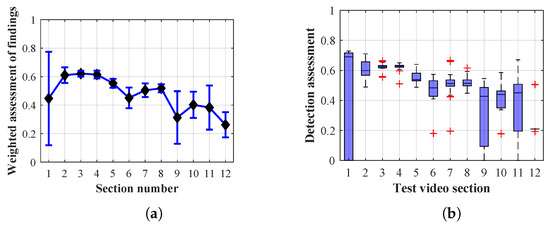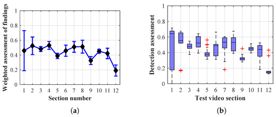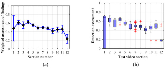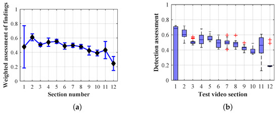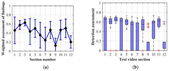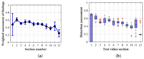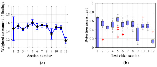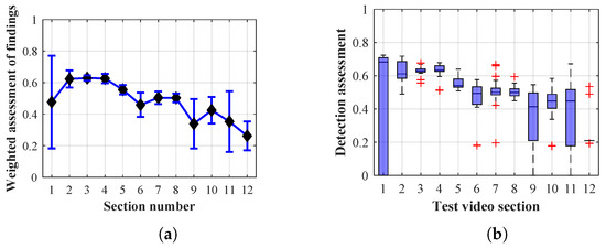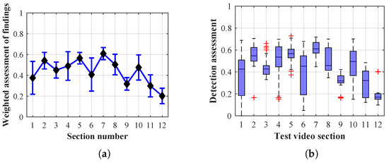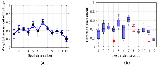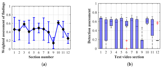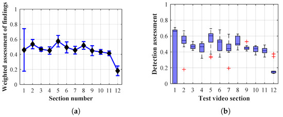 Other methods applied mentioned in Section 2 using both static and dynamic backgrounds achieved results confirming the theoretical assumptions. An important role in their application was played by the suitably selected lifespan parameter of the persons detected. As it is obvious from Figure 27, Figure 28, Figure 29, Figure 30, Figure 31, Figure 32, Figure 33, Figure 34, Figure 35, Figure 36, Figure 37, Figure 38, Figure 39, Figure 40, Figure 41, Figure 42, Figure 43, Figure 44, Figure 45, Figure 46 and Figure 47 with the plotted results of the individual sections assessment at the given system configurations, the average rating further evaluated with an error entered does not always correspond with the statistical distribution of the individual statistical files—the video sections. Outlying values are also included in the average in order to make the evaluation as strict as possible.