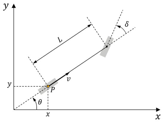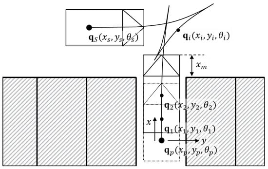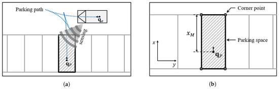The overall process of parking path planning is described in Figure 1a. First, the vehicle, which is located in , tries to start from outside of the parking space. At that time, the parking space is defined as a space consisting of four corner points as shown in Figure 1b. The target state indicates position and orientation of the parking space where the center of the rear wheel of the vehicle () should be at this location. The distance between the front line and , which is represented , depends on the vehicle length.