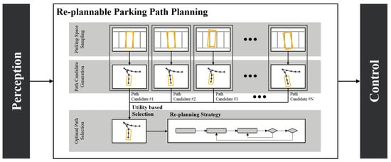 The overall re-planning diagram is shown in Figure 9. The initial information might be insufficient for locating the vehicle in the actual parking space because of the uncertainty of the perception system. If the uncertainty is high or all paths are considered to collide, the maximum expected utility may be lower than the threshold utility . In this case, it is regarded that there is no available path. Then, the planner’s only option is to return the Parking Space Sampling.