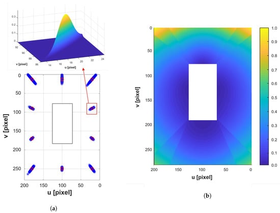 During parking, when vehicle motion (pitch and roll) occurs, the geometric relationship can be affected by the motion, which will cause measurement error. The change of the geometric relationship should be adjusted for reducing the measurement error. However, it is difficult to compensate for the change in the geometric relationship since it is not easy to measure the roll and pitch motion of the vehicle. Due to this phenomenon, the corner points detected by the AVM includes position errors as shown in Figure 3a. The fixed points, which is represented as the red dot, are measured as the blue dots when the vehicle is moving. For simplification, the measured points are modeled as Gaussian distribution at each pixel as shown in Gauss distribution in Figure 3a, and this can be expanded at every pixel like Figure 3b from [34]. In the measurement model of the AVM features, the variances tend to increase with farther distance from the ego vehicle. For example, the farther detected distance from the sensor has higher covariance and the shorter detected distance has lower covariance.