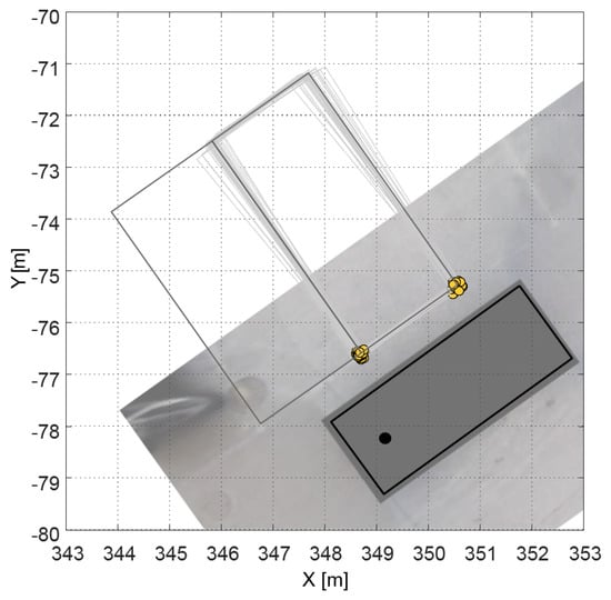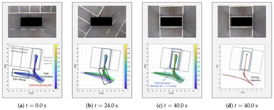On the other hand, Figure 13 shows the overall process of the proposed algorithm. Firstly, the sampled parking spaces were created such as the light gray rectangles in Figure 13 at t = 0 s. Then, each utility of the generated path candidates was calculated and described as spectrum lines. Through this process, the optimal path, which was considered a perception error, was selected at s (the red line). The vehicle started from the optimal path. Then, the detected parking spaces, which are represented as dark gray rectangles, continuously changed during parking. Due to the changed parking space, the vehicle followed another optimal path when the maximum expected utility was calculated again using (17). The position and orientation difference between the first detected parking space and the last detected parking space (the blue dashed rectangle and the gray rectangle in Figure 13c) are over 15 cm and 2.5 deg, respectively. This value can cause a crash if there is another vehicle next to the parking space. Through the proposed algorithm, the vehicle reached the actual parking space with a smaller error than the planner without re-planning. For understanding, the entire process of the re-planning is described in the Supplementary Materials.