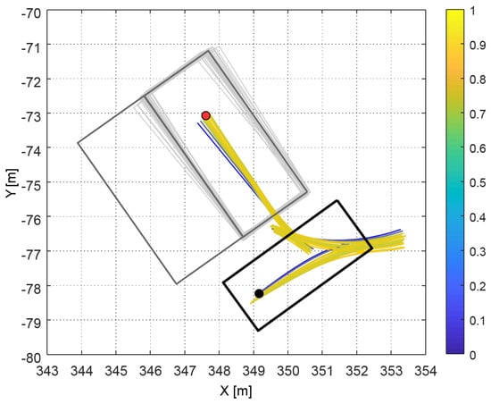 where measures how close the path candidate is to the detected target state. Through , the ideal path to the actual target state is selected. estimates how near the path candidate is to the ego vehicle. The high value of means that the realistic path near the ego vehicle would be selected. measures the probability of the path candidate. The probability of the path candidate is equal to the probability of the sampled target state because only one path candidate can be generated from one target state. Based on (17), the probability of the path candidate determines whether the path is ideal or realistic. For example, if there is an ideal path candidate that has a high probability close to the detected target state, the vehicle follows the ideal path candidate. On the other hand, if all path candidates have low probability, the vehicle selects the realistic path candidate near the ego vehicle. The expected utility of path candidates is shown in Figure 8. The expected utility is higher when the path candidate is close to the target state and near the ego vehicle. Each of terms in (17) is covered in detail in the following section.