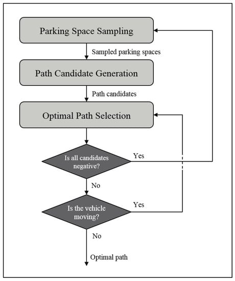 The remainder of this paper is arranged as follows. The overview of the proposed method is provided in Section 2. Then, the proposed method is divided into three parts: Parking Space Sampling, Path Candidate Generation, and Optimal Path Selection. These are explained from Section 3, Section 4, Section 5. The experimental results are shown in Section 6, and this paper is concluded in Section 7.