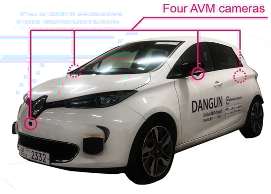 The tests were conducted using the test vehicle ZOE from Hanyang University (Figure 11). The dimensions of the vehicle were as follows: the total length was 4.084 m, the total width was 1.730 m, and the wheelbase was 2.845 m. Then, we chose a parking lot with the dimensions 2.3 m × 5.0 m, as specified by the Department of Transportation. The surface of the parking lot was uneven, inclined or declined. Such parking lots might cause unexpected errors for a perception system. Nevertheless, we wanted to show that the proposed system completes parking in these conditions.