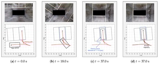 The parking process in the open scenario (see Figure 10a) without a re-planning scheme is shown in Figure 12. In this case, the planner generated a parking path (the red line) using the first detected parking space (the blue dashed rectangle). The driving trajectory of the ego vehicle is shown as the black dashed line in Figure 12c. As a result, the vehicle was in the first detected parking space even though there was a detection error in this space. In this case, there were no obstacles around the vehicle; however, if other vehicles were already parked next to the ego vehicle, this position error might have caused an accident.