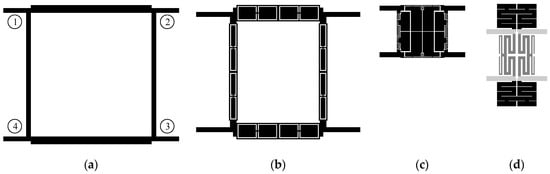 Comparison of microstrip equal-split branch-line couplers in terms of size: (a) A conventional structure [58], as well as circuits (b) miniaturized using standard symmetrical cells (size reduction: 30%) [53], (c) manually developed cells (reduction: 84%) [24], and (d) a combination of horizontal (black) and vertical (dark gray) CCs (reduction: 75%). Due to the implementation of couplers on different substrates, miniaturization rates are calculated based on dimensions expressed in terms of guided wavelength [61]. Numbers in circles next to the conventional design denote the enumeration scheme of BLC ports that is used in the work.