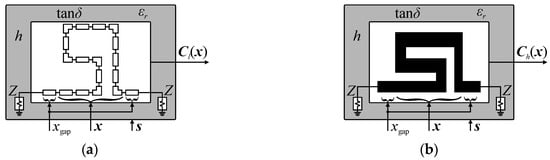 Conceptual illustration of a compact cell (here, in horizontal configuration): (a) low-fidelity model Cl(x) and (b) high-fidelity EM-based model Ch(x). Response of the cell is controlled using input variables vector x, whereas parameters xgap and s = [ZH h εr t tanδ]T maintain separation between adjacent cells and control simulation conditions.