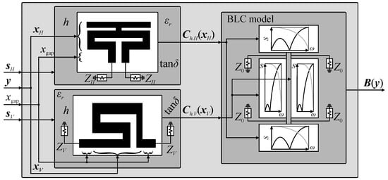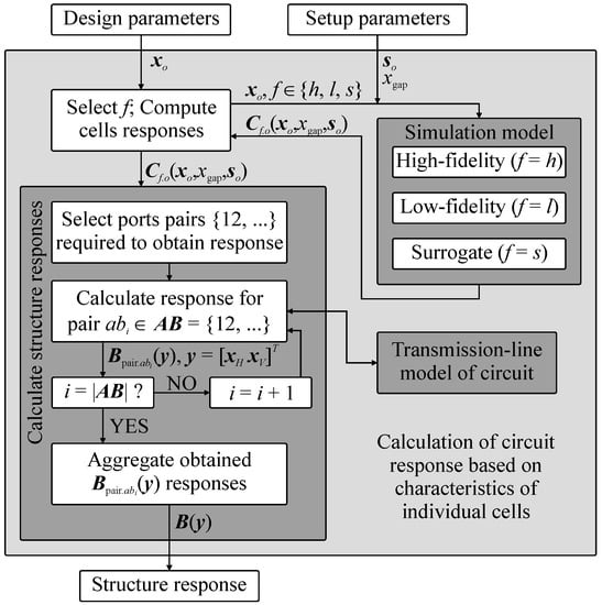 It should be stressed out that (1)–(2) support the high-fidelity, low-fidelity and surrogate-based representations of cells, i.e., B(y) = Bf(y), f ∈ {h, l, s}. The benefits of the considered model are as follows (i) it operates only on electrical responses and thus supports seamless combination of cells developed using various software packages, (ii) it is universal as the type of the circuit under design (here, BLC) can be changed only through modification of Vab function, (iii) it can be rapidly re-used to obtain structure responses for various combinations of cells topologies. An important remark is that (2) neglects the cross-coupling effects between the cells which limits its accuracy [35,37]. These, however, are accounted for in a high-fidelity EM model of the assembled coupler (cf. Figure 1), denoted as BA(y). The latter is used only at the final stage of the design process. The detailed block diagram that summarizes calculation of BLC responses based on characteristics of individual CCs is shown in Figure 3.