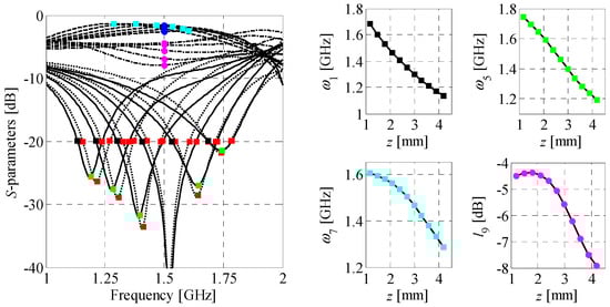 where ωn and ln, n = 1, …, N represent the frequency point and its corresponding value of the response (also referred to as level), respectively. As shown in Figure 6, the nth coordinate can be defined either for a fixed frequency point, or for a desired level of circuit response. This flexibility makes features a convenient tool for tracking the key changes of structure responses. Another advantage is less non-linear dependency of the features as a function of input parameters compared to original frequency characteristics (cf. Figure 7 and Figure 8). The mentioned properties make this form of data representation an efficient tool for addressing challenges related to unsupervised design of compact couplers. In particular, description of circuit responses in terms of response features improves convergence of the optimization process and reduces its computational cost, as compared to design tasks that involve direct evaluation of frequency responses [56,57].