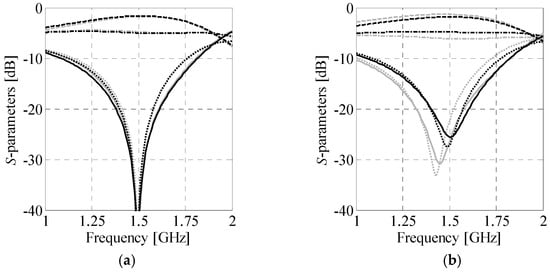 where p(j) = [xc(j) α(j)]T is a set of parameters used for adjusting the correction layer. The vector xc(j) = [h1 h2 … εr1 εr2 …]T represents a set of control variables (also referred to as the preassigned parameters) for implicit space mapping (ISM), i.e., substrate thickness h and permittivity εr. They can be adjusted to reduce discrepancy between the surrogate and the high-fidelity model responses [63,64]. The component α(j)ω = α0(j) + α1(j)ω represents frequency scaling. It is used to “shift” and/or “stretch/squeeze” response of the surrogate w.r.t. the original frequency sweep ω.