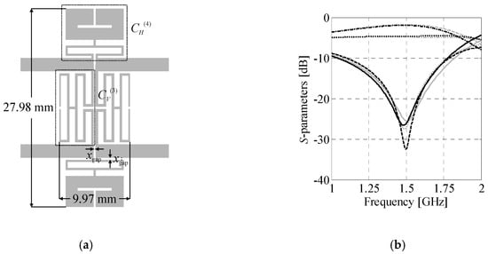 Here, Rs(j)(z) represents the surrogate model response of the structure under design at jth iteration of (5). The surrogate is implemented as the equivalent-circuit model enhanced using the correction layer. The latter is determined based on occasional evaluations of the high-fidelity model which are performed to verify the quality of z(j+1) designs [48,62]. The high-fidelity data is also used to gradually improve the Rs(j)(z) accuracy by updating the correction layer. In this work, the low-fidelity model correction is applied only at the level of individual cells. The correction layer is implemented as a combination of the implicit space mapping (SM) and frequency scaling [62,63]. The surrogate model of the cell Rs(j)(z) = Cs(j)(x) is of the following form,