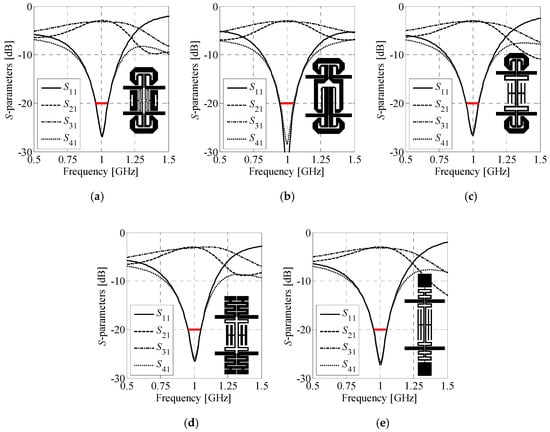 where F(y) = P(Bf(y)). The feature coordinates ωn and ln, n = 1, 2, …, 9 are defined as shown in Figure 6. The parameters ωl = max(ω1, ω2) and ωh = min(ω3, ω4) represent lower and upper corner frequency for which |S11| and |S41| are both below the specified threshold (here, −20 dB). The bandwidth is defined as BW = 2min{ωh − ω0, ω0 − ωl,}. Parameters ΔC0, ΔCmax, and Smax denote desired power-split imbalance at the center frequency, acceptable power-split error—i.e., deviation of ΔC = |l8 − l9| from the desired value of ΔC0 (here, 0.2 dB)—and maximum allowed reflection level of S11 and S41 at ω0 (here, −26 dB). The scaling coefficients are set to β1 = 10 and β2 = 1000. The particular values are determined based on the numerical experiments.