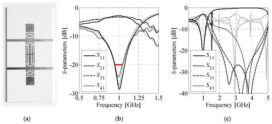 It is worth noting that low-pass properties of compact cells make them useful for construction of BLCs with harmonic suppression capability [15,24,28,31,32]. The mechanism is demonstrated in Figure 15a where broadband responses of the BA(3,1) structure are compared against characteristics of the conventional BLC. Although the CCs used for construction of BA(3,1) circuit have been optimized only for the center frequency of 1 GHz (cf. Section 3 and Section 4.3), the coupler features |S21| and |S31| below −20 dB within 2.2 GHz to 4.3 GHz range. At the same time, the conventional structure is not capable of suppressing unwanted frequencies.