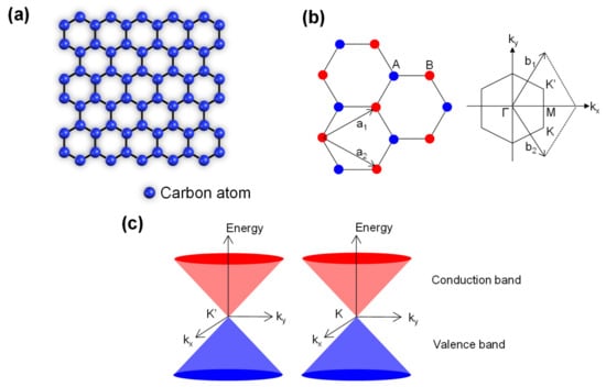 As shown in Figure 1a–c, graphene comprises atomically-thin carbon sheets having a hexagonal lattice structure. This material exhibits unique optical and electrical properties because of its Dirac cone-type bandgap structure, where the energy depends linearly on the wave vector around the K point [14,15,16]. Specifically, graphene has exceptional electrical, optical and chemical properties that are well-suited to sensor applications and that are not achievable with conventional technologies based on bulk materials [17]. These characteristics include high carrier mobility, fast photoresponse, broadband photodetection from the ultraviolet to the THz regions of the spectrum, flexibility and low cost [18]. Thus, graphene and other two-dimensional materials are the focus of an increasing number of research studies and novel phenomena associated with these materials are still being discovered [19]. At the same time, new applications such as high-speed transistors [20], photodetectors [21,22], biological sensors [23,24], gas sensors [25], energy storage [26], displays [27] and flexible devices [28] are being proposed based on the novel physics of such materials [29,30].