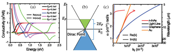 Figure 2a,b plot the optical conductivity calculated for graphene for various Fermi levels, EF [41] and the energy band structure of graphene, respectively. Here, , where is the Fermi velocity of approximately 106 m/s and is the Fermi wave vector (where n is the free carrier concentration). At higher energy (), the real part of the optical conductivity maintains a constant value and is attributed to interband transitions [45].