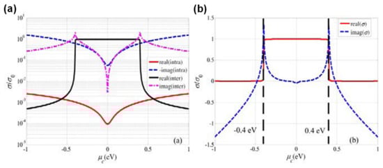 At this point, we can examine intrinsic graphene SPPs. The optical conductivity of graphene, σg, can be described as in Equations (3)–(7), which are derived from the Kubo formula [39,42,43,44]. This conductivity has both intraband (σintra) and interband (σinter) transitions, such that: