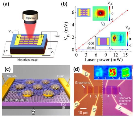 - Echtermeyer, T.J.; Britnell, L.; Jasnos, P.K.; Lombardo, A.; Gorbachev, R.V.; Grigorenko, A.N.; Geim, A.K.; Ferrari, A.C.; Novoselov, K.S. Strong plasmonic enhancement of photovoltage in graphene. Nat. Commun. 2011, 2, 458. [Google Scholar] [CrossRef]