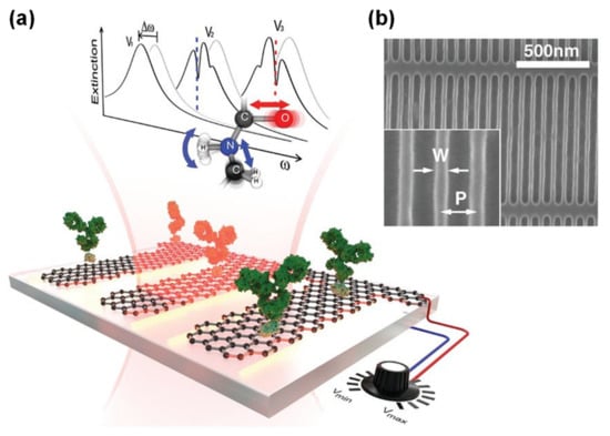 Graphene has also shown promise as a component of biological sensors, as it has a large surface area and is biocompatible with antibodies, enzymes, DNA, cells and proteins [24]. In particular, surface-enhanced infrared absorption (SEIRA) can significantly enhance the sensitivity in the IR wavelength range using SPPs [99]. Therefore, graphene plasmonics has become an important component of the recent development of biological sensors. Figure 6 [100] presents a schematic of a proposed GNR-based biosensor that takes advantage of graphene SPPs [100,101]. Incident IR irradiation generates SPR across the GNRs. The electromagnetic field is strongly localized at the GNR edges, which enhances the interaction between the IR rays and the protein molecules adsorbed on the GNRs. Such sensors are based on principles (i) and (iii) as outlined in the Introduction. In these devices, the electromagnetic field generated by the graphene SPPs is concentrated at the GNR edges and increases the light-matter interactions of molecules adsorbed on the graphene. Proteins can be recognized by monitoring the SPR spectral shifts associated with narrow dips corresponding to the molecular vibration bands of the protein. Moreover, the gate voltage tunability of graphene-based SPR enables continuous sweeping over the protein vibrational bands [100].