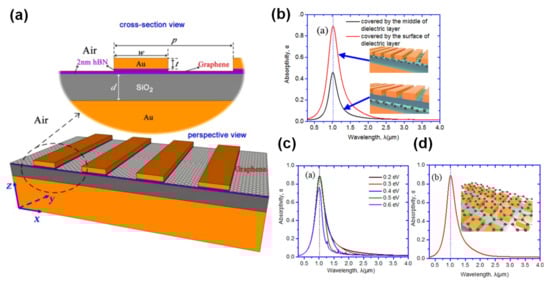 Graphene integrated metamaterial absorbers. (a) A schematic of graphene embedded in an MIM absorber using hexagonal boron nitride (hBN) and (b) schematics of graphene coated over top of MIM absorbers together with absorbance data for graphene in the middle and the top of the insulator layers. (c) The absorbance plots of this device for various chemical potentials. (d) The absorbance of graphene coated over top of metal-insulator-metal (MIM) absorbers. (a) is reprinted from Reference [115] with the permission of AIP Publishing. (b–d) were adapted with permission from Reference [118]. © 2020 Optical Society of America.