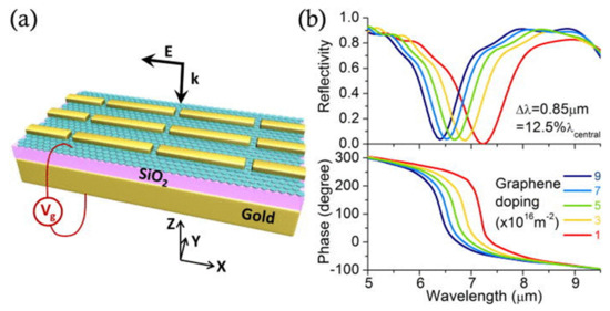 As discussed in Section 2.2, the optical conductivity of graphene can be tuned by applying a voltage, such that the modulation of SPP wavelengths can be achieved using metallic nanostructures. Typically, this modulation is associated with the integration of graphene with metasurfaces [120,121,122,123,124,125,126,127], split rings [122,128,129] or other metamaterials [130,131,132,133,134] or with metallic nanoparticles [135,136]. Figure 8 shows a typical example of the modulation of the device reflection and the reflection phase by adjusting the extent of doping of the graphene. The device structure consists of a MIM-based PMA with embedded graphene, which is similar to those in Figure 7.
