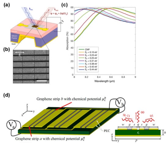 (a) A schematic illustration of a phase modulator based on graphene embedded with metallic resonators. (b) An SEM image of the resonators. (c) The absorption spectra for various graphene Fermi levels. (d) A schematic illustration of a reconfigurable reflector based on graphene embedded in MIM-based metasurfaces. (a–c) are adapted from Reference [147]. © 2020 American Chemical Society. (d) is adapted from reference [148]. © 2020 American Chemical Society.